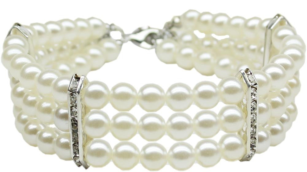 Three rows of pearls held in line with rows of crystals.eWith a jewelry clasp for closure, these necklaces are the essence of class.